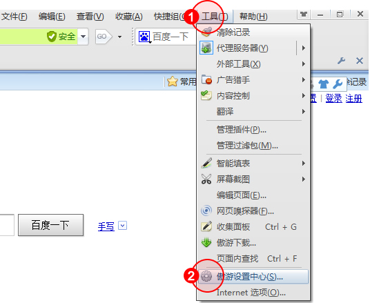 1.點(diǎn)擊"工具"菜單,選擇"遨游設(shè)置中心"。