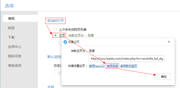3.選擇"啟動(dòng)時(shí)打開(kāi)"-“主頁(yè)”,點(diǎn)擊“修改主頁(yè)”按鈕,在彈窗中點(diǎn)擊“使用百度”,再點(diǎn)擊“確定”按鈕即可 。