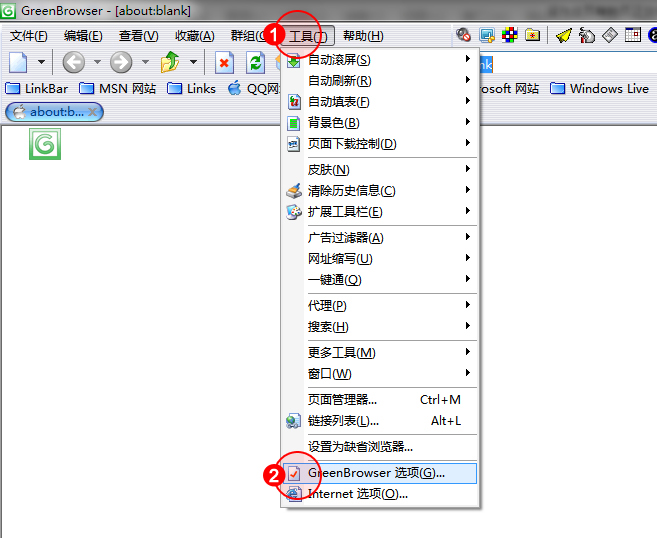 1.選擇"工具"菜單,點(diǎn)擊GreenBrowser選項(xiàng)。