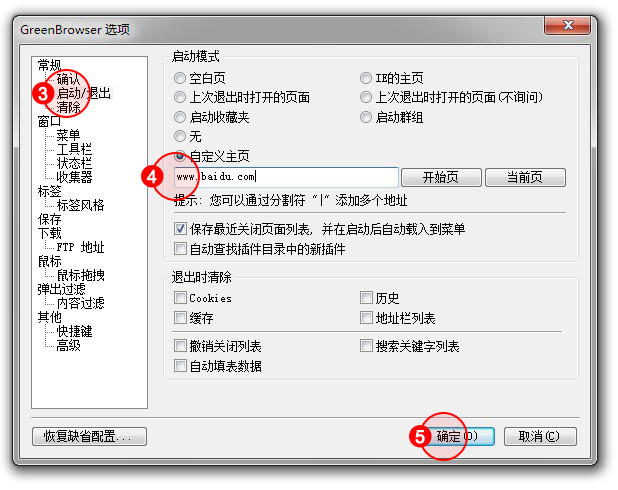 2.在左邊欄選擇"啟動(dòng)/退出"項(xiàng),點(diǎn)選"自定義主頁(yè)"并輸入"www.f2202.cn",點(diǎn)擊確定,設(shè)置成功。