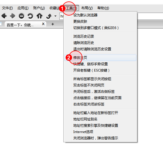 1.點(diǎn)擊"工具"菜單,選擇"修改主頁(yè)"。
