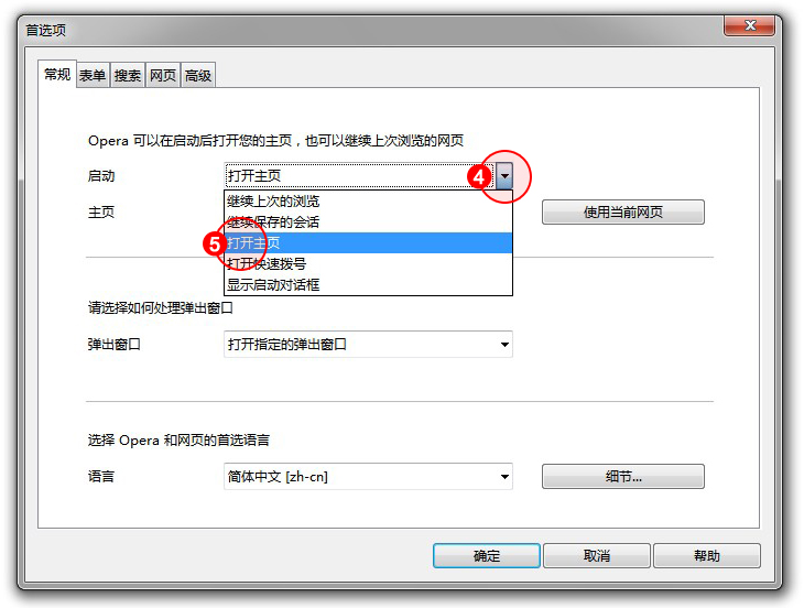 2.點(diǎn)擊"啟動(dòng)"項(xiàng)的文字框,選擇"打開(kāi)主頁(yè)"。