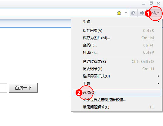1.點(diǎn)擊瀏覽器右上角工具按鈕,選擇"選項(xiàng)"。