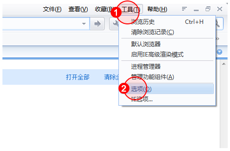 1.點(diǎn)擊瀏覽器菜單欄中的工具按鈕,點(diǎn)擊"選項(xiàng)"。